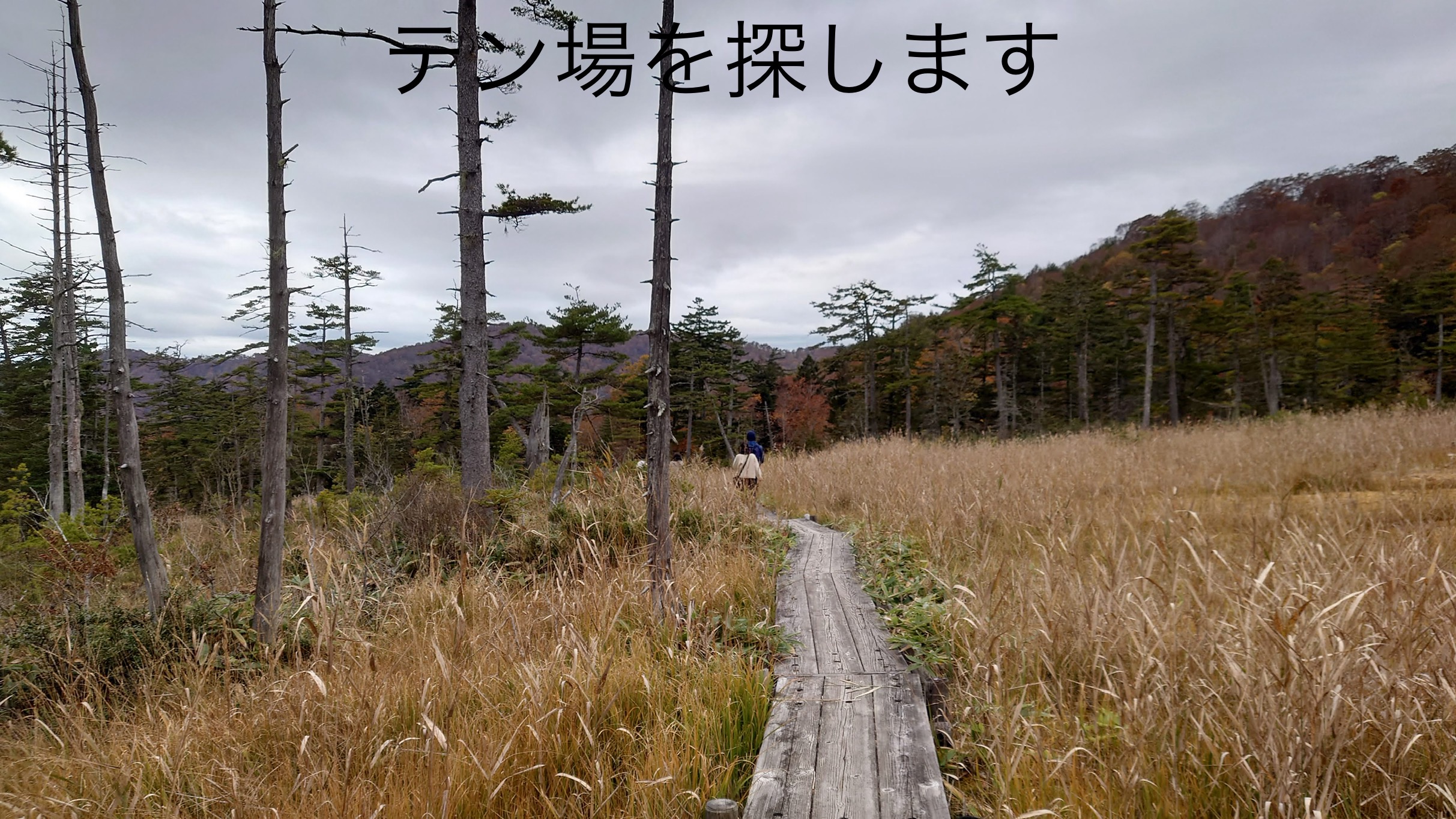 頂上駅到着後、Ueponとtakaさんには待っていてもらい、fukuさんと共にデコ平方面に下りながらテントが張れる場所を探して歩きます。幾つかの平坦な場合を確認しながら広い湿原迄行き折り返して頂上駅に戻りました。